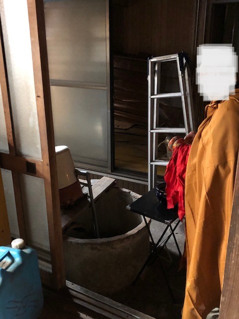 以前、家屋解体前に井戸終いのお経をお寺様にお願いしたときの写真です。水道が無かった頃、食事や洗濯に使用する生活水として、井戸は神聖な場所として扱われていた為、現在では井戸を終う際には、感謝の意を込めて読経(お祓い)をして、息抜き(地下に溜まったガス抜き)の道を作って神様が通り抜けられるようにして井戸を終いました。